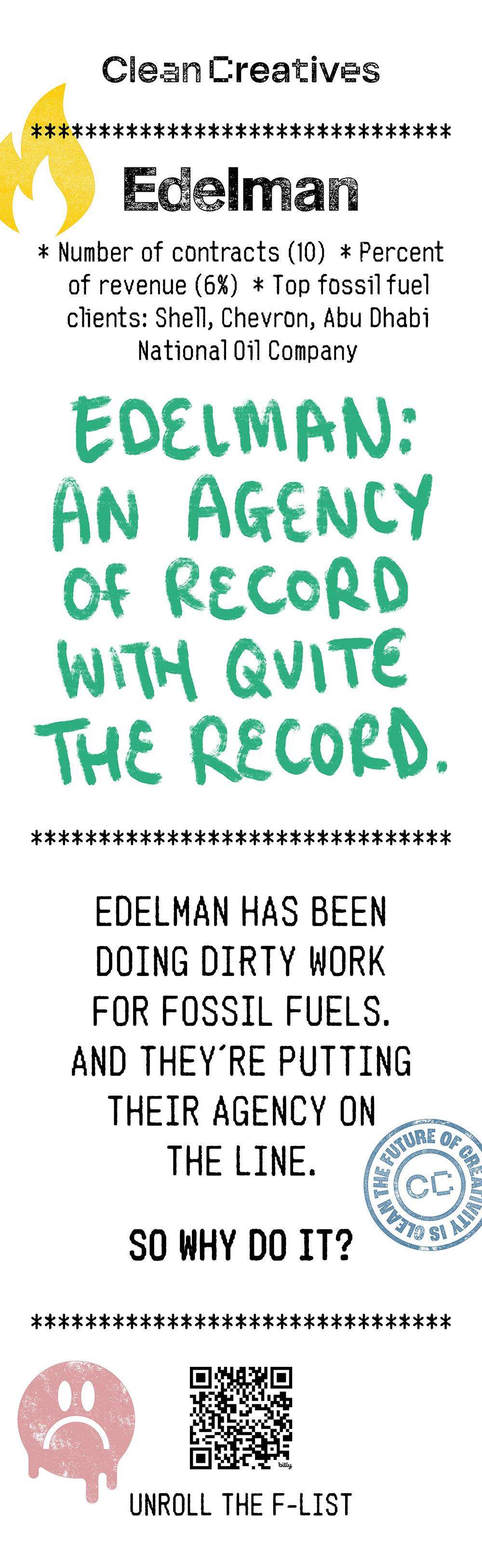 If climate inaction is powered by disinformation produced by the creative industries, then shutting off that pipeline is a climate solution, the Clean Creatives campaign contends. And if there’s a feasible path to drop fossil fuel contracts while growing in other sectors, then we might conclude that Edelman and the other agencies that continue to do this dirty work are choosing to fuel the climate crisis. This, a person with a spine might argue, is evil.