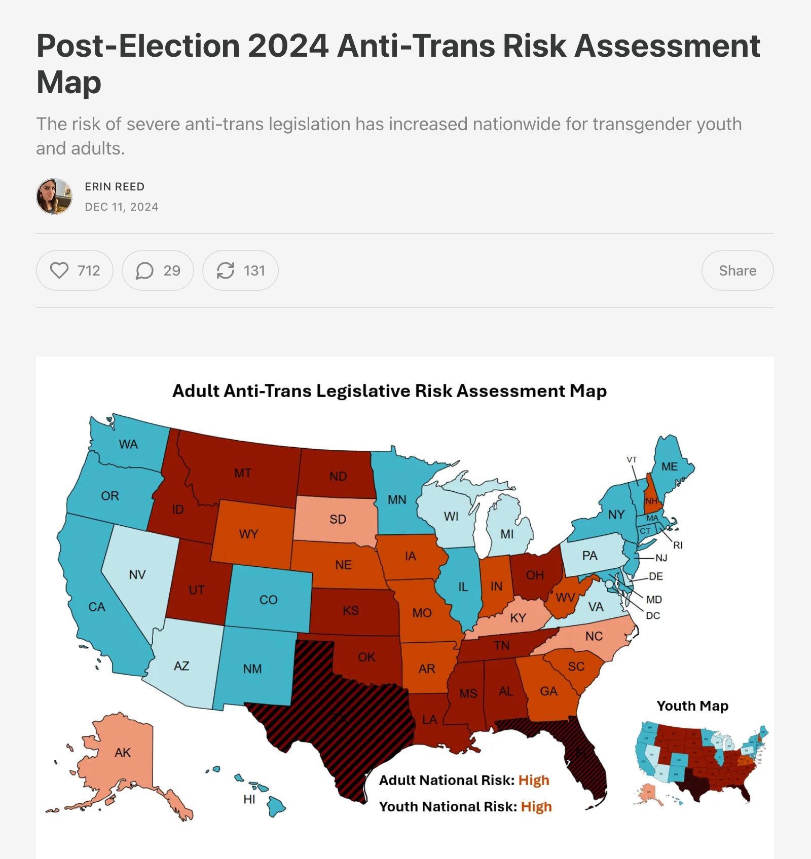 Example five: “It feels very much like a classic fascist tactic of overwhelming a marginalized target with so much noise,” I observe about, well, gestures at everything during our conversation. Haimson nods emphatically. We're discussing the context to Erin Reed’s Anti-Trans Legislative Risk Map, a color-coded geography of American fascism that has become essential survival infrastructure for trans people navigating an increasingly balkanized and hostile landscape.